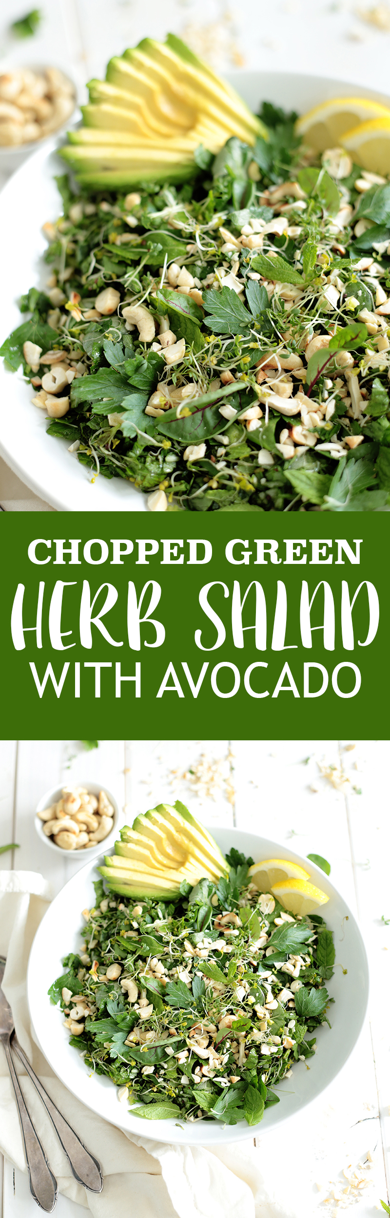 This chopped green herb salad with avocado is the most flavourful salad ever. It’s loaded with beautiful vibrant herbs for freshness, toasted cashews for crunch and avocado for creaminess. Perfect by its own or as a side dish on the last summery nights and the first colder fall days.